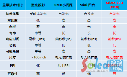 COB(chip on board)微顯示技術(shù)集70%的封裝技術(shù)與30%的顯示技術(shù)于一身。雷曼光電以及三星、索尼等國際顯示巨頭在100吋以上大尺寸顯示時均選擇了COB技術(shù)路線。它與LCD、OLED、激光投影、SMD小間距、Mini四合一相比,不僅保持了優(yōu)異的顯示性能,而且在防腐蝕能力、抗沖擊能力、長期穩(wěn)定工作能力方面具有特殊優(yōu)勢。