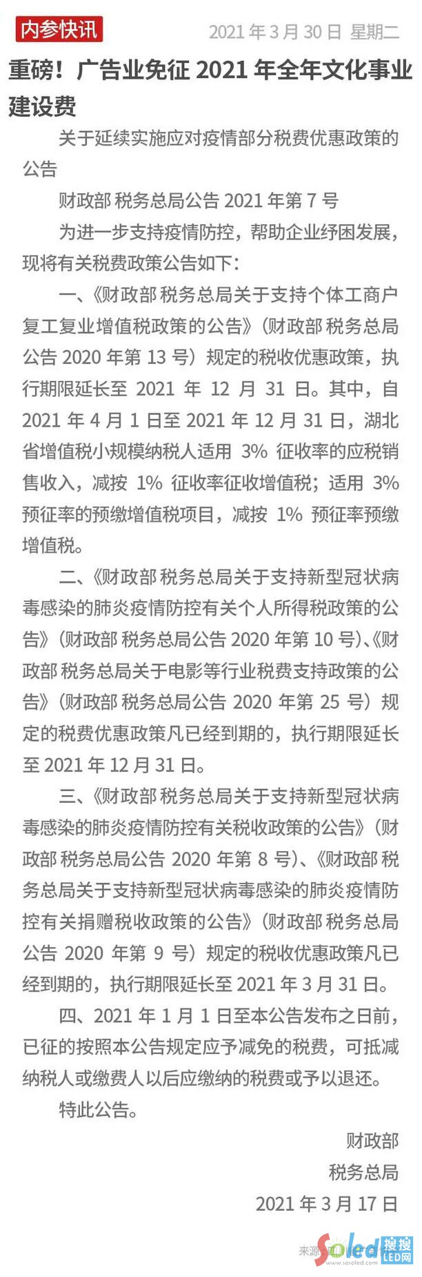 核心提示:重磅!廣告業(yè)免征2021年全年文化事業(yè)建設費