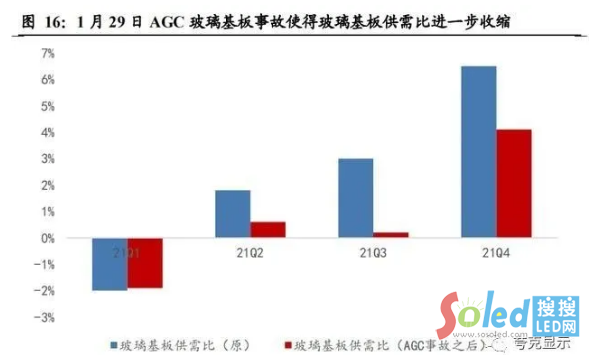 從節(jié)奏上看,2021年二季度京東方B17持續(xù)爬坡,惠科長沙線于2月實現(xiàn)量產(chǎn)后也在持續(xù)爬坡,供應端是存在一定邊際增量的,但由于1月底AGC玻璃基板供應中 斷事件影響,友達、群創(chuàng)、惠科 3 月起來自旭硝子玻璃基板供應受到影響(友達、群創(chuàng)6代玻璃基板供應量將減少 30%,而惠科位在重慶和滁州 8.6 代廠,其玻璃基板也將減少30%的供貨量),新增的供給并非供需平衡下的壓力,更多地僅僅是供 給緊張狀態(tài)的緩解,實際的新增壓力在 AGC 玻璃基板供應恢復后可能會得到顯現(xiàn)。