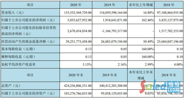 其中京東方發(fā)布的2020年年度報告顯示,公司在2020年實(shí)現(xiàn)營收為1355.53億元,同比增長16.80%;歸母凈利潤50.36億元,同比增長162.46%;總資產(chǎn)4242.57億元,同比增長24.63%。
