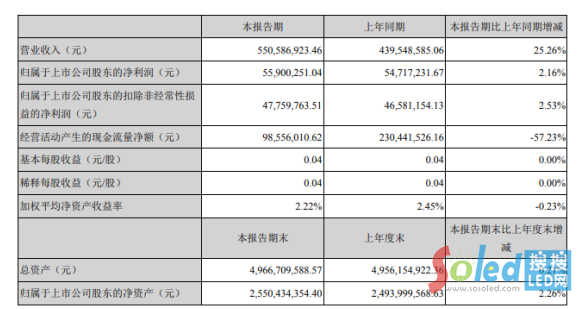 4月24日,聚飛光電(300303)發(fā)布2021年第1季度報(bào)告,報(bào)告期內(nèi)公司實(shí)現(xiàn)營(yíng)業(yè)收入550,586,923.46元,同比增長(zhǎng)25.26%;歸屬于上市公司股東的凈利潤(rùn)55,900,251.04元,同比增長(zhǎng)2.16%。