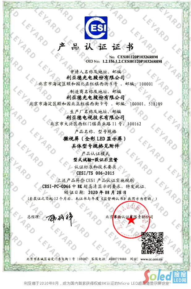 2020年,利亞德8K Micro LED超高清顯示屏首獲中國(guó)電子標(biāo)準(zhǔn)院(簡(jiǎn)稱CESI)頒發(fā)的權(quán)威8K認(rèn)證,成為國(guó)內(nèi)首家獲得該認(rèn)證的LED超高清顯示屏企業(yè)。