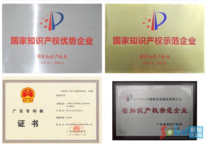 目前,國(guó)星光電及子公司已申請(qǐng)專利近千項(xiàng),已授權(quán)專利近700項(xiàng)。基于持續(xù)完善的知識(shí)產(chǎn)權(quán)保護(hù)體系,高質(zhì)量專利保護(hù)備受認(rèn)可,國(guó)星光電已全面覆蓋國(guó)家、省、市知識(shí)產(chǎn)權(quán)相關(guān)平臺(tái)及榮譽(yù),曾榮獲國(guó)家知識(shí)產(chǎn)權(quán)示范企業(yè)、國(guó)家知識(shí)產(chǎn)權(quán)優(yōu)勢(shì)企業(yè)、廣東省專利優(yōu)異獎(jiǎng)等國(guó)家級(jí)、省級(jí)榮譽(yù)獎(jiǎng)項(xiàng)。