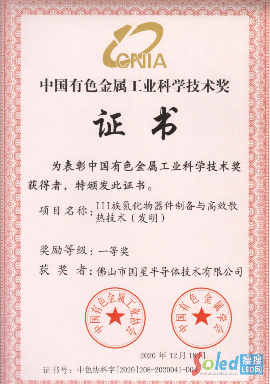 近期,中國有色金屬工業(yè)協(xié)會(huì)、中國有色金屬學(xué)會(huì)聯(lián)合發(fā)布了《關(guān)于頒發(fā)2020年度中國有色金屬工業(yè)科學(xué)技術(shù)獎(jiǎng)的通知》,國星光電全資子公司國星半導(dǎo)體憑借“Ⅲ族氮化物器件制備與高效散熱技術(shù)(發(fā)明)” 榮獲中國有色金屬科學(xué)技術(shù)獎(jiǎng)一等獎(jiǎng)。