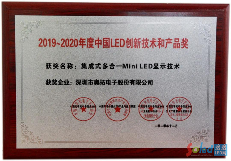 2020年12月,奧拓電子集成式多合一Mini LED顯示技術(shù)榮獲中國LED行業(yè)“2019-2020年度中國LED創(chuàng)新技術(shù)和產(chǎn)品獎”。