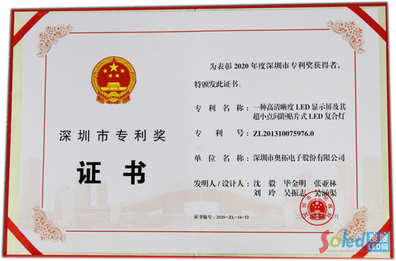2021年1月,奧拓電子集成式多合一Mini LED技術(shù)發(fā)明專利“一種高清晰度LED顯示屏及其超小點間距貼片式LED復(fù)合燈”獲得深圳市專利獎。