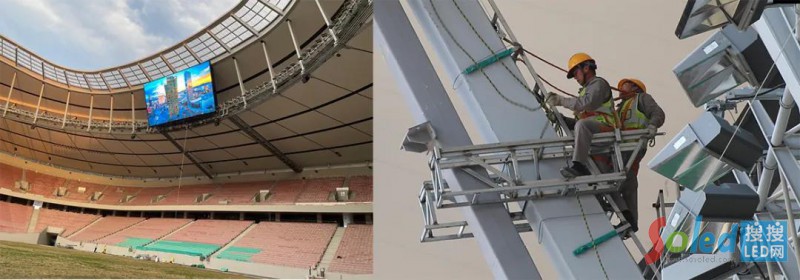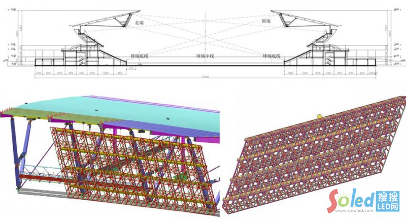 為克服這個難題并保證建筑和施工的安全,工程團(tuán)隊多次前往現(xiàn)場勘察與實地測量,由于場館的特殊性采用懸掛固定的安裝方式,并反復(fù)精確計算顯示屏的位置、角度、高度及各個定位點,除此以外,顯示屏結(jié)架構(gòu)、結(jié)構(gòu)受力分析等與穩(wěn)定與安全相關(guān)的因素都需要一一分析。