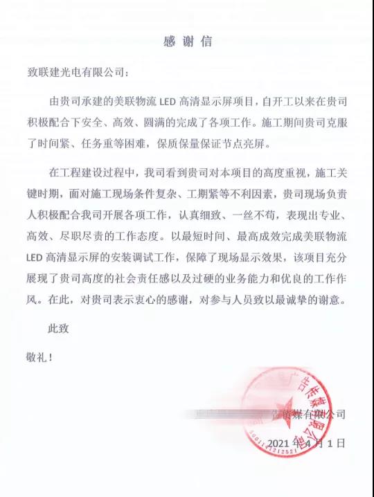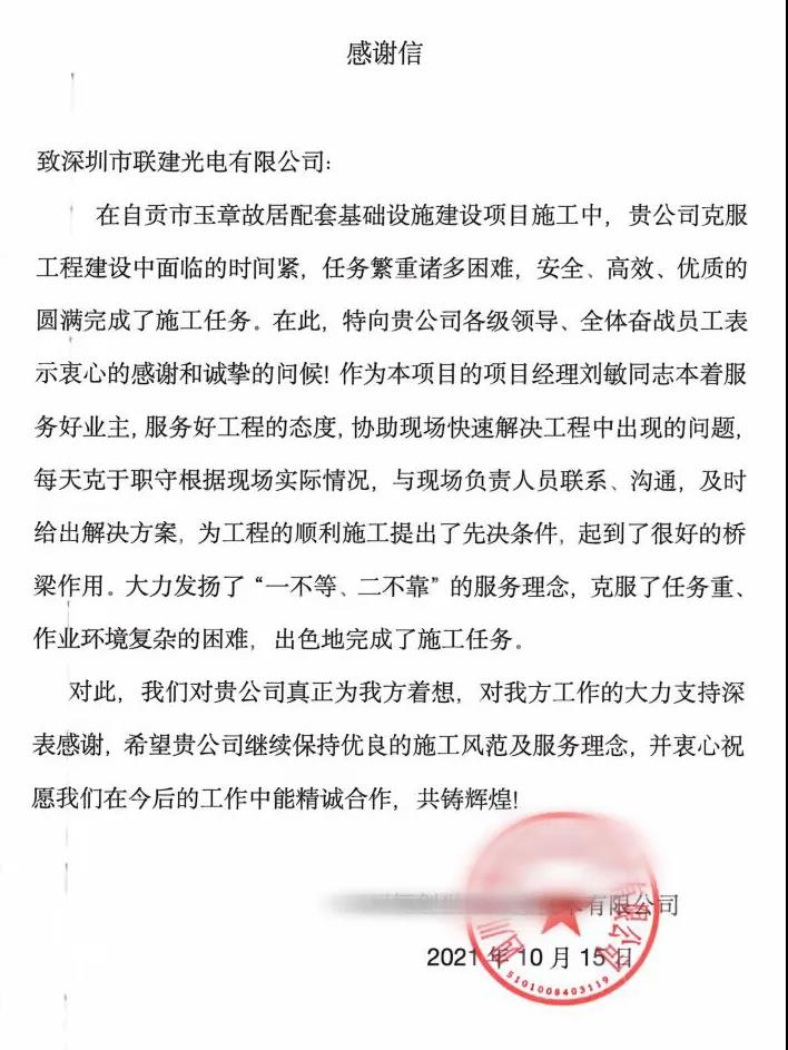 *聯(lián)建光電美聯(lián)廣場(chǎng)、玉章故居項(xiàng)目感謝信