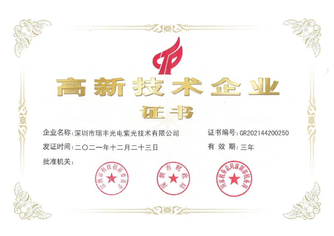 近日,瑞豐光電全資子公司深圳市瑞豐光電紫光技術(shù)有限公司(以下簡稱“瑞豐紫光”) 憑借卓越的自主創(chuàng)新能力,強(qiáng)大的綜合科研實(shí)力,經(jīng)過層層審核與評(píng)定,獲得深圳市科技創(chuàng)新委員會(huì)、深圳市財(cái)政局、國家稅務(wù)總局深圳市稅務(wù)局聯(lián)合頒發(fā)的《高新技術(shù)企業(yè)證書》。