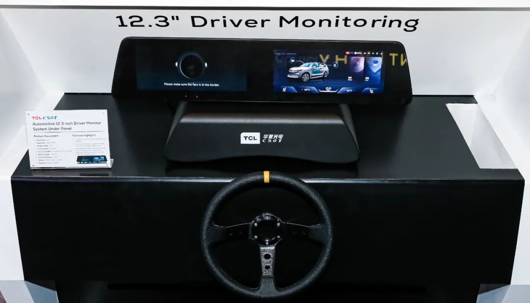 除了上述極致產(chǎn)品外,TCL華星還有數(shù)十款領(lǐng)先產(chǎn)品亮相SID,涵蓋多種應用場景。比如12.3" 車載屏下監(jiān)控系統(tǒng),該系統(tǒng)順應歐盟GSR法規(guī)要求集成DMS,可以通過對采集的圖像數(shù)據(jù)進行識別,可以實現(xiàn)分心駕駛檢測、疲勞駕駛檢測、視線追蹤、人臉識別4大功能,能更好地滿足車載顯示的集成化、智能化趨勢。本次Demo AA區(qū)尺寸為292×109mm,LCM亮度為1200nit,色域為70% NTSC,可客制化以滿足不同客戶的具體需求。