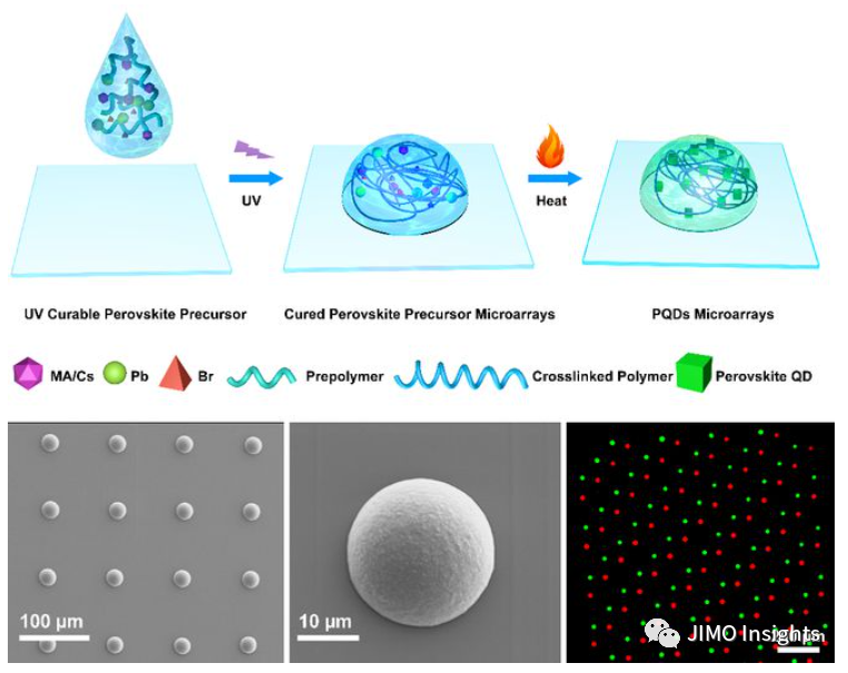 MicroLED是實(shí)現(xiàn)虛擬/增強(qiáng)現(xiàn)實(shí)(VR/AR)顯示的重要技術(shù),而全彩化是其發(fā)展所面臨的關(guān)鍵挑戰(zhàn)。量子點(diǎn)色轉(zhuǎn)換技術(shù)(QDCC)將紅、綠量子點(diǎn)色轉(zhuǎn)換膜置于藍(lán)光microled上取代紅、綠LED,被認(rèn)為是解決MicroLED顯示所面臨的紅光LED缺失、巨量轉(zhuǎn)移等難題的候選技術(shù)路線之一。與傳統(tǒng)CdSe和InP量子點(diǎn)相比,鈣鈦礦量子點(diǎn)具有高的吸收系數(shù)、可原位制備等特點(diǎn),成為量子點(diǎn)色轉(zhuǎn)換應(yīng)用的重要材料體系之一。北京理工大學(xué)智能光子學(xué)課題組是國際上最早開展鈣鈦礦量子點(diǎn)的課題組之一。2015年,張峰、吳顯剛等人發(fā)明了鈣鈦礦量子點(diǎn)再沉淀制備技術(shù),首次展示了鈣鈦礦量子點(diǎn)的寬色域LED器件(ACS Nano 2015, 9, 4533);2016年,周青超等人發(fā)明了鈣鈦礦量子點(diǎn)原位制備技術(shù)(Advanced Materials 2016, 28, 9163),經(jīng)過產(chǎn)學(xué)研合作,在全球率先推出了搭載鈣鈦礦量子點(diǎn)光學(xué)膜的電視樣機(jī)和首批商業(yè)化電視。近日,該團(tuán)隊(duì)的楊高嶺特別副研究員與光電學(xué)院趙躍進(jìn)教授合作,將微透鏡結(jié)構(gòu)引入Micro LED發(fā)光像素中,構(gòu)筑出了具有三維結(jié)構(gòu)的新型鈣鈦礦量子點(diǎn)微陣列,相關(guān)研究成果以“Perovskite Quantum Dot Microarrays: In Situ Fabrication via Direct Print Photopolymerization”為題,在國際知名期刊Nano Research上發(fā)表(DOI:10.1007/s12274-022-4466-4)。立足Micro LED量子點(diǎn)色轉(zhuǎn)換技術(shù),本工作提出了將噴墨打印與光聚合結(jié)合的策略,發(fā)明了直接打印光聚合原位制備技術(shù),原位制備出具有微透鏡光學(xué)結(jié)構(gòu)的鈣鈦礦量子點(diǎn)圖案,實(shí)現(xiàn)了像素尺寸20微米、高度接近10微米的半球形三維鈣鈦礦量子點(diǎn)彩色微陣列,為解決打印像素中發(fā)光不均勻、藍(lán)光泄露等問題提供了新的思路,為Micro LED色轉(zhuǎn)換、CCD紫外增強(qiáng)探測等光轉(zhuǎn)換應(yīng)用提供了新的技術(shù)路線。