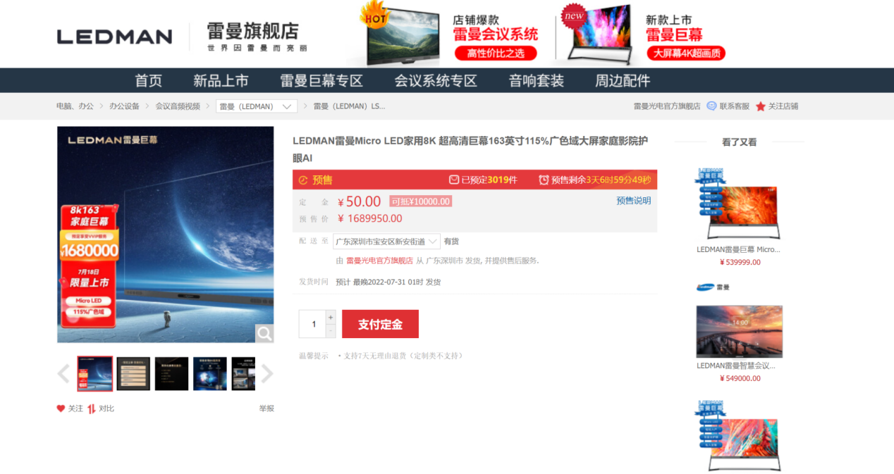 近期備受關(guān)注的雷曼8K 163吋 Micro LED巨幕有了最新消息,一度引發(fā)大家猜想的售價終于“塵埃落定”,根據(jù)官方旗艦店公布的信息,其售價為168萬元。消息一出就在業(yè)內(nèi)引發(fā)巨震,折合下來該產(chǎn)品每英寸平均價格為1萬余元。面對雷曼的這款“天價”產(chǎn)品,業(yè)界人士更為關(guān)心的是,它究竟采用了什么核心技術(shù),是哪些因素支撐起了這么高昂的售價。