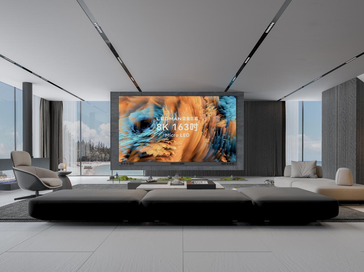 要打造這樣的巨幕并非易事,涉及到一系列技術(shù)難題。作為雷曼全球首臺8K 163吋超高清Micro LED巨幕,采用了自主研發(fā)的COB封裝技術(shù),使用了超過100項雷曼的自主LED專利。在這些技術(shù)的支撐下其分辨率可以達(dá)到7680×4320像素,屬于8k超高清分辨率級別,由于是Micro LED巨幕,我們可以看到這款產(chǎn)品亮度、分辨率、色域、防藍(lán)光、反應(yīng)速度和使用壽命上均有卓越的表現(xiàn),無需吊機(jī)和拆門就可輕松入戶。而且因為是自發(fā)光其屏占比相比其他顯示器更高,定制型產(chǎn)品可以做到屏占比達(dá)99%,外觀及顯示效果都更為驚艷。除此之外,雷曼還在里面內(nèi)置了性能強(qiáng)大的智能內(nèi)核,它和8K Micro LED顯示屏強(qiáng)強(qiáng)聯(lián)手,可以呈現(xiàn)出更加完美的顯示效果,帶來極佳的視覺沖擊力及豐富的交互體驗。
