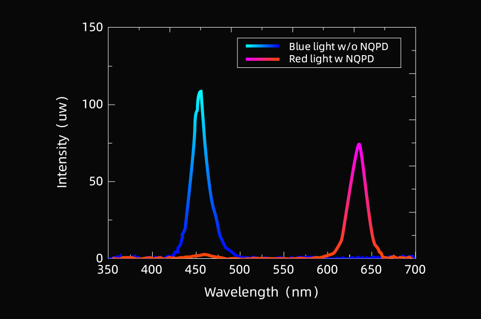 紅光NPQD® Micro LED光引擎可在48萬尼特的亮度下,實現(xiàn)5.4%的WPE,并在亮度增至74萬和93萬尼特時,仍保持4.2%和3.5%的WPE。其芯片的綜合紅-藍能量色轉(zhuǎn)換效率達到48%,紅-藍光子轉(zhuǎn)換效率達到67%,并通過了3000小時的第三方上屏可靠性測試,真正將高效、高亮度、高可靠性的紅光NPQD Micro LED推到商用階段。