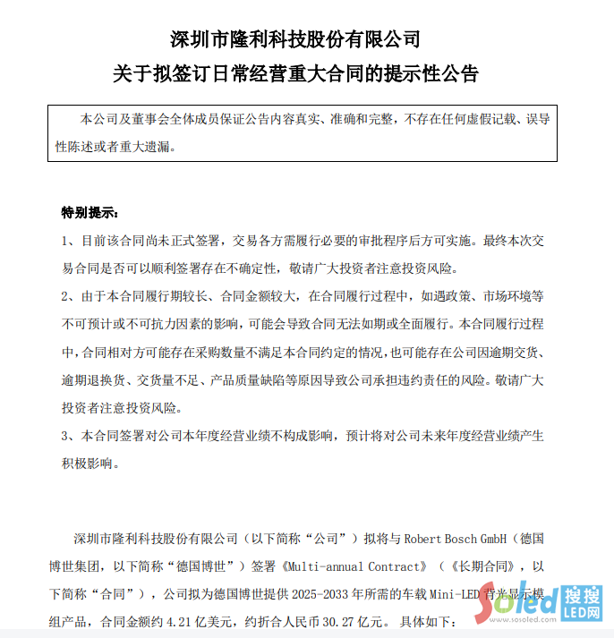 隆利科技10月17日午間公告,公司擬將與Robert Bosch GmbH(“德國(guó)博世”)簽署《Multi-annual Contract》(《長(zhǎng)期合同》),公司擬為德國(guó)博世提供2025-2033年所需的車載Mini-LED背光顯示模組產(chǎn)品,合同金額約4.21億美元,約折合人民幣30.27億元。
