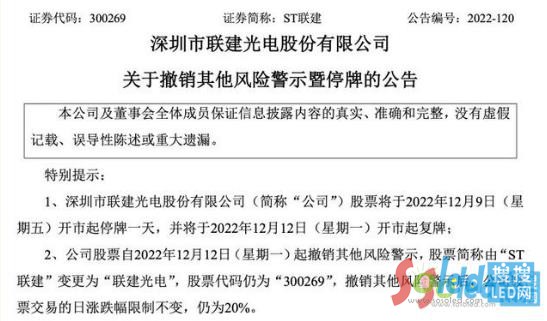 12日,LED顯示屏行業(yè)知名企業(yè)聯(lián)建光電成功“摘帽"”,正式從“ST聯(lián)建”變更為“聯(lián)建光電”。