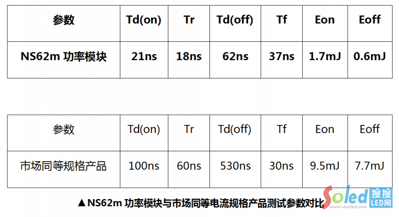 根據(jù)實(shí)驗(yàn)數(shù)據(jù)可得,與市場(chǎng)同等電流規(guī)格的產(chǎn)品對(duì)比,NS62m功率模塊動(dòng)態(tài)特性開通延遲時(shí)間減少79納秒;上升時(shí)間減少42納秒;關(guān)斷延遲時(shí)間減少468納秒。開啟損耗降低82%,關(guān)斷損耗降低92%,整體開關(guān)損耗表現(xiàn)優(yōu)秀。