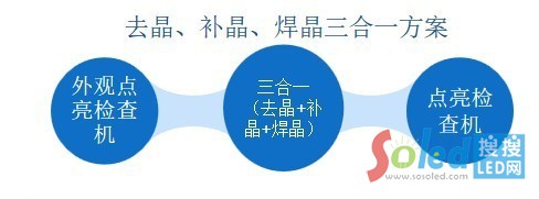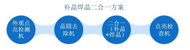同時(shí),為更符合實(shí)際產(chǎn)生需求,合易科技還推出不同的檢修方案。一是可以減少設(shè)備數(shù)量和產(chǎn)線的補(bǔ)晶焊晶二合一自動(dòng)檢修方案,二是直顯背光都適用的去晶補(bǔ)晶焊晶三合一自動(dòng)檢修方案。補(bǔ)晶焊晶二合一自動(dòng)檢修方案中,補(bǔ)晶焊晶二合一設(shè)備將接收上位機(jī)器晶圓坐標(biāo),自動(dòng)進(jìn)行補(bǔ)晶、焊晶,將單點(diǎn)修補(bǔ)時(shí)間壓縮為為10到15秒,修補(bǔ)良率同樣高達(dá)99.99%。