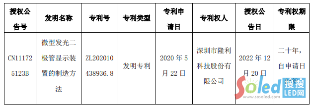12月21日,隆利科技宣布,公司近日收到由國家知識產(chǎn)權(quán)局頒發(fā)的一項發(fā)明專利證書,專利名稱為《微型發(fā)光二極管顯示裝置的制造方法》。