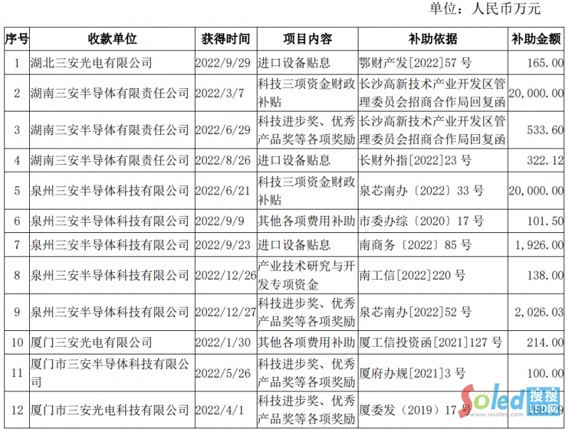 從補(bǔ)助款明細(xì)表來(lái)看,獲得補(bǔ)助款的全資子公司包括:湖北三安、湖南三安半導(dǎo)體、泉州三安半導(dǎo)體、廈門(mén)三安光電、廈門(mén)三安半導(dǎo)體、廈門(mén)三安集成、天津三安、蕪湖安瑞光電及重慶安瑞光電。其中,款項(xiàng)最高的兩筆2億元,收款單位分別是湖南三安半導(dǎo)體與泉州三安半導(dǎo)體,項(xiàng)目?jī)?nèi)容均為科技三項(xiàng)資金財(cái)政補(bǔ)貼。