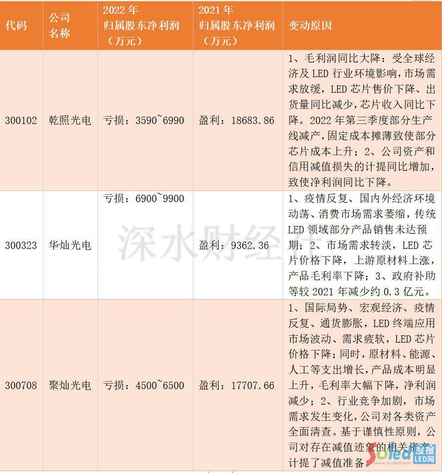 深水財經(jīng)社觀察到,聚燦光電的預(yù)虧并非個案,目前A股LED芯片行業(yè)上市公司,已公布2022年業(yè)績預(yù)告的聚燦光電、乾照光電和華燦光電3家凈利潤均告虧損(見下表)。