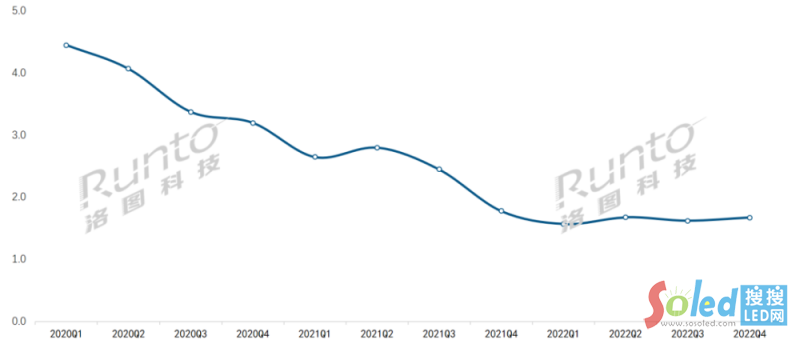 價格是影響市場規(guī)模下降的主要因素之一。根據(jù)洛圖科技(RUNTO)數(shù)據(jù)顯示,2022年,中國大陸小間距LED顯示屏市場均價是1.8萬元/㎡;與疫情之初的2020年第一季度相比,下降了將近2.8萬元/㎡。