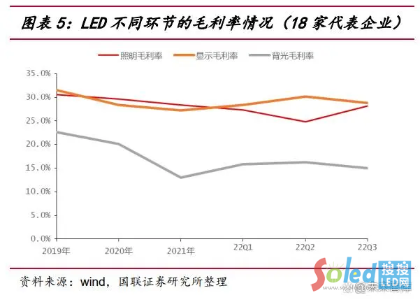 1)增速逐季變差。2022 年國內(nèi)受疫情影響,LED 企業(yè)營收增速逐季下滑,照明 市場下滑尤其明顯;仡櫼咔槌跗冢瑖鴥(nèi) LED 需求在 2020 年受到重大沖擊,2021 年 LED 市場快速恢復。我們相信,2023 年在國內(nèi)政策重心回到經(jīng)濟增長上來后, LED 應用市場也將迎來復蘇。 2)毛利率企穩(wěn)回升。2021 年受疫情沖擊,全球供應鏈中斷頻發(fā),例如 LED 顯 示驅(qū)動 IC 出現(xiàn)缺貨,價格上漲幾倍。同時,海運費大幅上漲。這些都對下游毛利率 造成不利影響。2022 年供應鏈逐漸恢復,海運費大幅下降,毛利率基本企穩(wěn)。預期 2023 年隨著需求復蘇,毛利率有望企穩(wěn)回升。 3)小間距板塊表現(xiàn)亮眼。對比而言,小間距是 LED 應用中增長最快的細分領域, 且毛利率較高。根據(jù)行家說 research《2022 小間距與微間距現(xiàn)實調(diào)研白皮書》預測, 2023 年開始 LED 顯示屏市場將迎來復蘇。這也是我們最看好的 LED 應用市場之一。