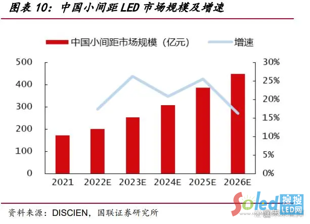 根據(jù) DISCIEN 的數(shù)據(jù),預計 2022 年中國小間距 LED 市場銷額將超過 200 億 元,未來四年復合增長率在 15%左右。盡管國內(nèi)疫情原因?qū)π¢g距實際需求產(chǎn)生沖 擊,實際銷售額下滑,但小間距市場增長的趨勢并沒有變化。