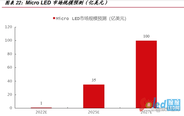 根據(jù)半導體分析機構(gòu) Yole 的研究和預測,未來 3-5 年將成為 Micro LED 走向消費級應用的關鍵時期。Micro LED 將首先在 VR/AR、智能手表、以及大屏顯示領域 開始量產(chǎn)應用:VR/AR 方面,Micro LED 2022 年從單色眼鏡開始發(fā)展,將在 2025 年進入消費級應用;智能手表方面,Micro LED 也將于 2024 年開始進入快速應用發(fā) 展階段;大屏顯示方面,Micro LED 預計將于 2025 年進入高端消費級電視市場,而 手機和車載顯示應用的時間則相對靠后。 據(jù)彭博社報道,蘋果公司正計劃最快在 2024 年底讓旗下高端 Apple Watch Ultra 采用 Micro LED,并逐漸將其擴展到 iPhone 和其他設備。 根據(jù) GGII 統(tǒng)計,今年已有超過 20 款搭載 Micro LED 的 AR 眼鏡。GGII 預計 2025 年全球 Micro LED 市場規(guī)模將達到 35 億美元,2027 年將達到 100 億美元。 目前制約 Micro LED 的技術瓶頸主要是巨量轉(zhuǎn)移,即如何綜合良率和效率,將 數(shù)以萬計的 LED 芯片轉(zhuǎn)移至 TFT 基板上,并按照微米級組裝構(gòu)成高密度級二維陣列 結(jié)構(gòu)。這是 Micro LED 生產(chǎn)工藝中面臨的最大障礙。
