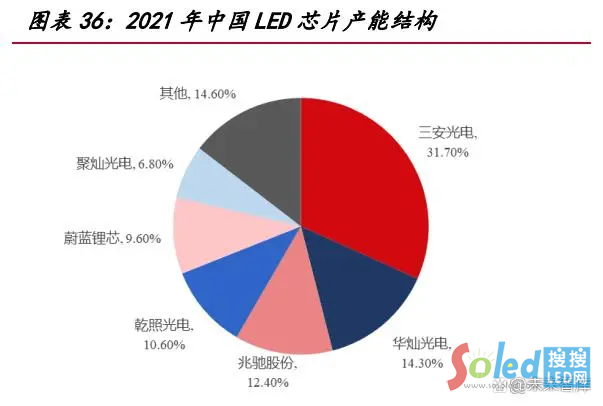 根據(jù) CSAResearch 數(shù)據(jù),2017 年以來,我國 LED 芯片總產(chǎn)能呈現(xiàn)先升后降的 變化趨勢。在 LED 芯片行業(yè)歷經(jīng)洗牌后,低端產(chǎn)能被淘汰。2021 年,我國 LED 芯 片產(chǎn)能達 1598 萬片/月,產(chǎn)值規(guī)模達 305 億元,同比增長 38%。根據(jù)行家說 Display 統(tǒng)計,2022 年疫情導致的市場需求低迷,造成價量同向下降。 隨著落后產(chǎn)能淘汰、高端 LED 應用的技術壁壘提升,以及龍頭企業(yè)規(guī)模優(yōu)勢顯 現(xiàn),龍頭企業(yè)的行業(yè)地位進一步穩(wěn)固。2021 年,三安光電、華燦光電、兆馳股份三 家企業(yè)分別占據(jù)中國 LED 芯片產(chǎn)能的 31.7%、14.3%、12.4%,合計近 60%。