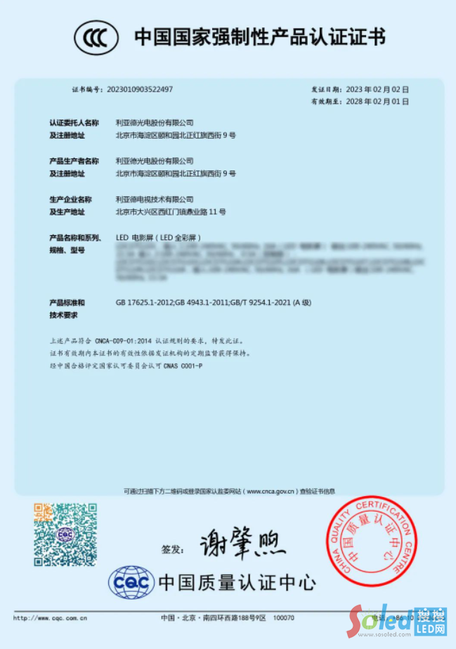 核心提示:近日,利亞德?lián)碛型耆灾髦R產權的LED電影屏相繼通過中國國家強制性產品認證(CCC)、中央宣傳部電影技術質量檢測。