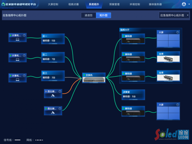 應(yīng)急場景機房各系統(tǒng)設(shè)備眾多,有技術(shù)經(jīng)驗的人員少,機房運維排查難,壓力大。支持音視頻系統(tǒng)拓補圖形化自動生成和自定義編輯,能夠直觀展示各場景下全鏈路設(shè)備狀態(tài),并支持拖拽式二次編輯等,方便問題定位和快速排故。滿足系統(tǒng)運行狀態(tài)的全面監(jiān)測,實現(xiàn)異常情況的及時預(yù)警。