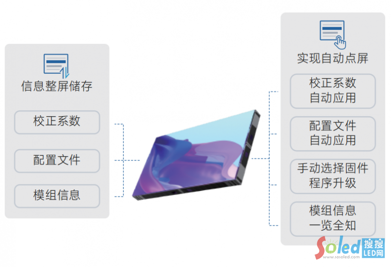 芯片內嵌監(jiān)控模塊,支持模組級通信誤碼率、溫度/電壓、燈珠狀態(tài)監(jiān)測,實現問題的快速、精準定位和維護。校正系數、配置文件、模組信息一芯儲存,提升了顯示屏生產及維護效率,降低了售后成本。