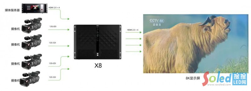 4路HDMI2.0、4路12G SDI信號(hào)源,點(diǎn)對(duì)點(diǎn)輸入,輸出到8K屏幕上