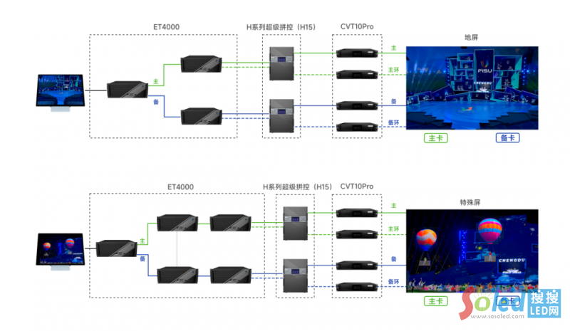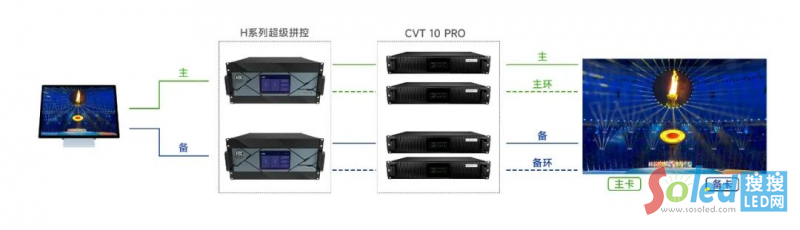 通過雙機(jī)4重備份保證現(xiàn)場畫面顯示萬無一失。使用2套系統(tǒng)同時連接顯示屏,雙通道同時輸出信號,4張發(fā)送卡連接箱體主、備接收卡建立信號回路,任意環(huán)節(jié)故障,立即按照優(yōu)先級迅速替換備份信號,整個切換時間控制在微秒級別,確保顯示屏在顯示上不會出現(xiàn)任何異,F(xiàn)象。