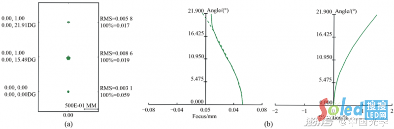圖5: 系統(tǒng)像差圖。(a)點列圖;(b)場曲畸變曲線