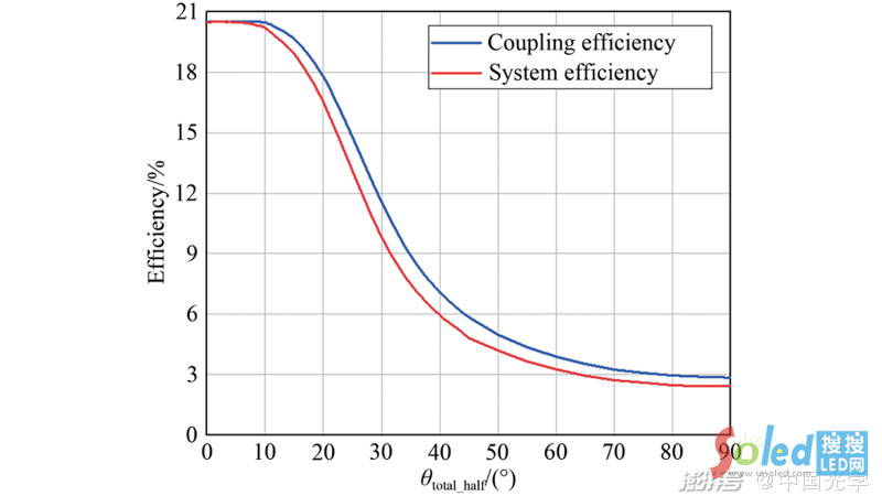 圖8: 固定孔徑角的鏡頭對不同發(fā)散半角的耦合效率和系統(tǒng)效率曲線