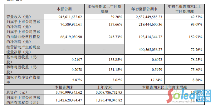 核心提示:10月17日晚間發(fā)布三季度業(yè)績(jī)公告稱,2023年前三季度營(yíng)收約25.37億元,同比增加42.57%;歸屬于上市公司股東的凈利潤(rùn)約2.19億元,同比增加93.09%;基本每股收益0.6073元,同比增加78.25%。