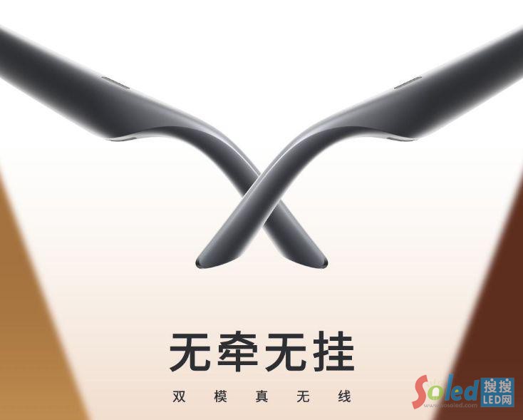 該眼鏡采用 " 雙模真無(wú)線 " 連接方式,口號(hào)為 " 無(wú)牽無(wú)掛 ",意味著它不需要使用實(shí)體線連接電源、數(shù)據(jù)設(shè)備,這無(wú)疑大大提高了使用的便利性。從官方海報(bào)可以看出,這款眼鏡的鏡腿處配有弧度設(shè)計(jì),似乎有揚(yáng)聲器開(kāi)孔,基本可以確定這款眼鏡是類似普通眼鏡 / 墨鏡的輕薄設(shè)計(jì)。