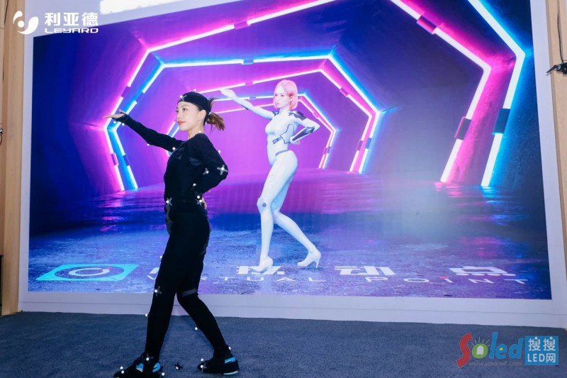 展會現(xiàn)場,利亞德虛擬動點架設(shè)了8臺OptiTrack空間數(shù)據(jù)采集攝像機,借助空間計算自研軟件,通過AI算法對動捕演員的身體動作進行識別、分析形成骨骼數(shù)據(jù),傳輸至引擎算力工作站,實時驅(qū)動自研高仿真數(shù)字人形象,為大家獻上一場場數(shù)字人“大秀”,引來眾多行業(yè)專家駐足洽談。