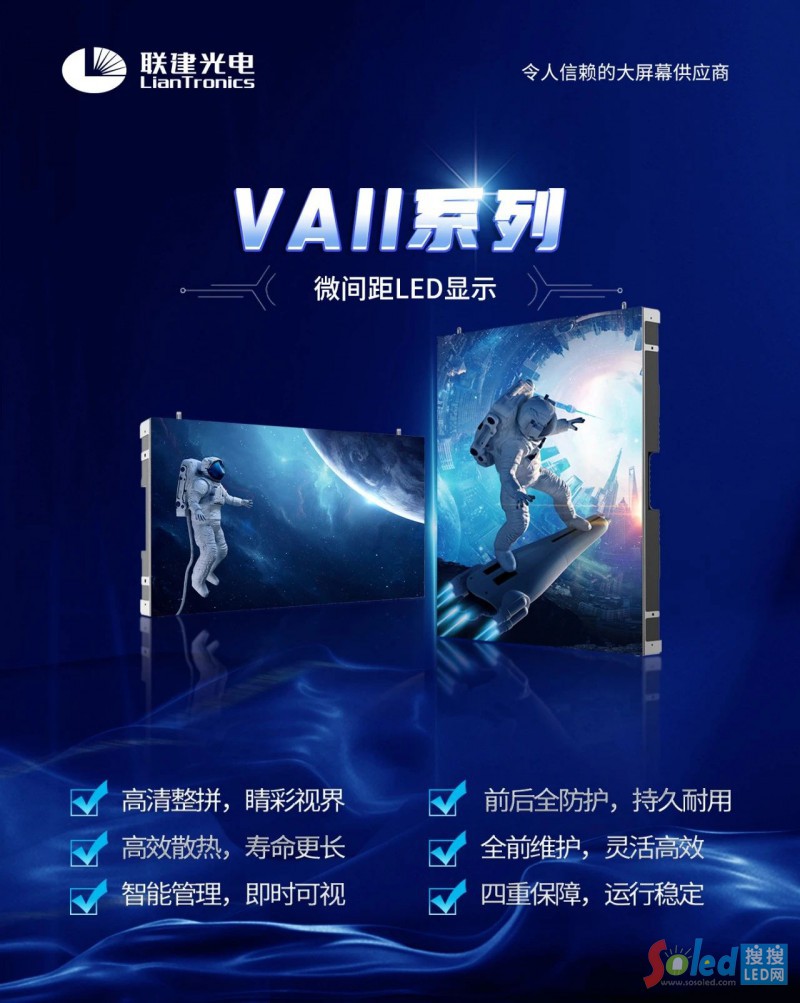 本次大屏均采用聯(lián)建光電爆款小間距產(chǎn)品——VAII系列。VAII是小間距界的常青樹,不僅顯示細(xì)膩?zhàn)匀,畫質(zhì)高清,高刷無影,對(duì)比度高,更設(shè)計(jì)隱藏式把手、防漏光設(shè)計(jì)、安全倒角、底部防磕碰等人性化細(xì)節(jié),讓使用體驗(yàn)更流暢,適用于能源生產(chǎn)、智慧城市、交通樞紐、展廳展示、會(huì)議中心等場景,具有全場景適配性。