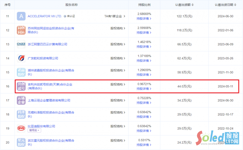 近日,愛企查官網(wǎng)顯示,上海顯耀顯示科技有限公司(以下簡稱“JBD”)發(fā)生工商變更,公司注冊資本增加至5584.17萬元,新增股東吉利共創(chuàng)貳號投資合伙企業(yè),持股JBD比例為0.97%,認繳出資44萬元。根據(jù)控股結(jié)構(gòu)信息顯示,吉利共創(chuàng)貳號投資合伙企業(yè)由吉利控股集團間接控股。