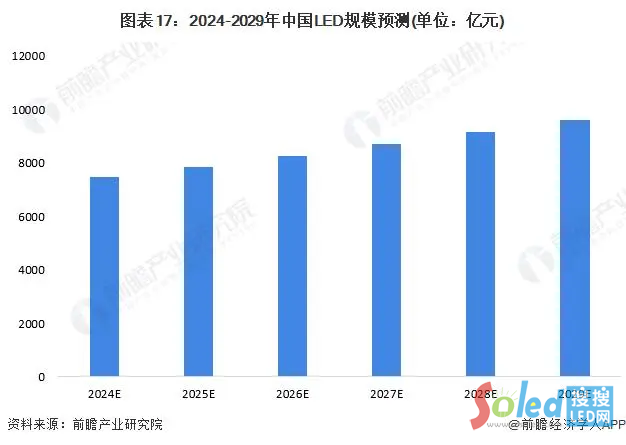 根據(jù)前瞻研究院發(fā)布的《2024年中國LED行業(yè)全景圖譜》,2017-2023年,LED行業(yè)的增速均值為5.2%,預(yù)計到2029年,整體市場規(guī)模將達到9625億元。