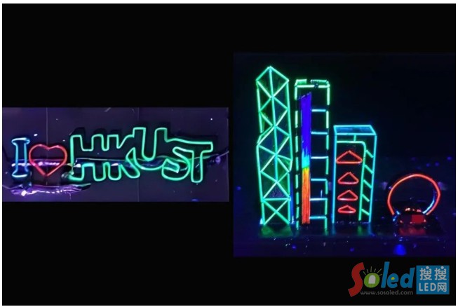 柔性全彩纖維LED的光致發(fā)光展示:I  HKUST圖案(左)和展現(xiàn)漸變顏色的維多利亞港「夜景」(右)