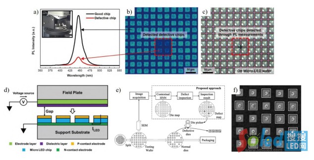 對于傳統(tǒng)的LED,檢測過程是容易的,因為大尺寸LED允許用探針連接,甚至可以用肉眼發(fā)現(xiàn)壞像素,并用機械去除方法或芯片鍵合器代替。隨著LED的尺寸下降到微米級,探針尺寸可能會大大超過被檢測的LED,并導致檢測困難。同時,LED尺寸的減小要求電路、傳感器等連接也應相應地小型化。為此,用傳統(tǒng)方法檢測和修復大量Micro LED芯片是很難實現(xiàn)的,人們迫切需要新的檢測和修復技術(shù)。