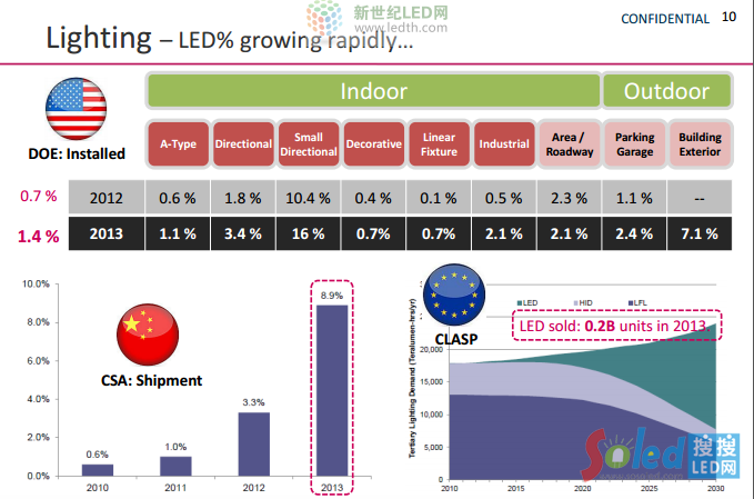 從全球的情況來看,2012年,LED的滲透率為0.7%,到了2013年上升到了1.4%。從安裝的數(shù)量來說,截止到2013年底,LED的安裝總數(shù),總計安裝377.92億只,在所有種類燈的安裝中只占1.4%。但是可以看到,相對其他照明市場,中國的增長幅度較快,2010年為0.6%,2011年為1.0%,2012年為3.3%,到了2013年有了比較大的生長,到了8.9%。歐盟也有所上升,在2013年,賣出了2億只左右的LED燈。所以從全球整體市場來看,LED照明市場在逐步增長,而且無論從滲透率還是安裝總數(shù)來看,整個市場還有一個非常可觀的成長空間。