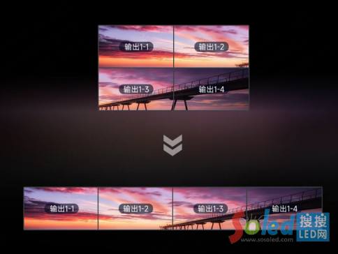 輸出口拆分重組,輕松解決接口超長(zhǎng)分辨率輸出問(wèn)題,最大可拆分為1024區(qū)域,讓長(zhǎng)條屏顯示更加靈活自由。