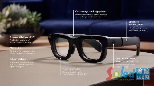 為將AI信息清晰的可視化,在顯示部分,Orion采用了碳化硅代替玻璃制作鏡片,其可以消除光學(xué)偽影或雜散光問(wèn)題,并具有較高的折射率,另外Orion還搭載了Micro LED+光波導(dǎo)的顯示光學(xué)方案,使其視場(chǎng)角達(dá)到了70°。