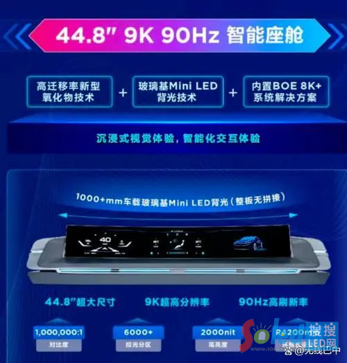 自2021年Mini LED技術(shù)進入商用元年以來,其發(fā)展迅速,已進入高速增長階段。據(jù)不完全統(tǒng)計,目前國內(nèi)市場中,包括京東方、深天馬、TCL華星等在內(nèi)的多家企業(yè)均在車用Mini LED背光技術(shù)領域有所布局。其中,京東方作為行業(yè)領軍企業(yè),近日發(fā)布了新款44英寸Mini LED車載顯示屏,背光分區(qū)數(shù)高達6000+,在顯示性能上表現(xiàn)出色,亮度達2000 nits,對比度高達100萬:1,分辨率更是達到了9K,刷新率也達到了90Hz。同時,該顯示屏還采用了R4200mm曲率半徑設計,為駕乘者帶來了沉浸式的視覺效果。