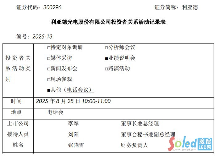 近日,利亞德光電股份有限公司(證券代碼:300296,證券簡稱:利亞德)以電話會(huì)議形式舉辦投資者關(guān)系活動(dòng),公司董事長兼總經(jīng)理李軍、董事會(huì)秘書兼副總經(jīng)理劉陽、財(cái)務(wù)負(fù)責(zé)人張曉雪出席,與中金、國信證券、匯添富基金、紅杉中國等數(shù)十家機(jī)構(gòu)投資者深入交流,解讀 2025 年半年度業(yè)績亮點(diǎn),并披露技術(shù)創(chuàng)新、海外布局及 AI 戰(zhàn)略等核心進(jìn)展。